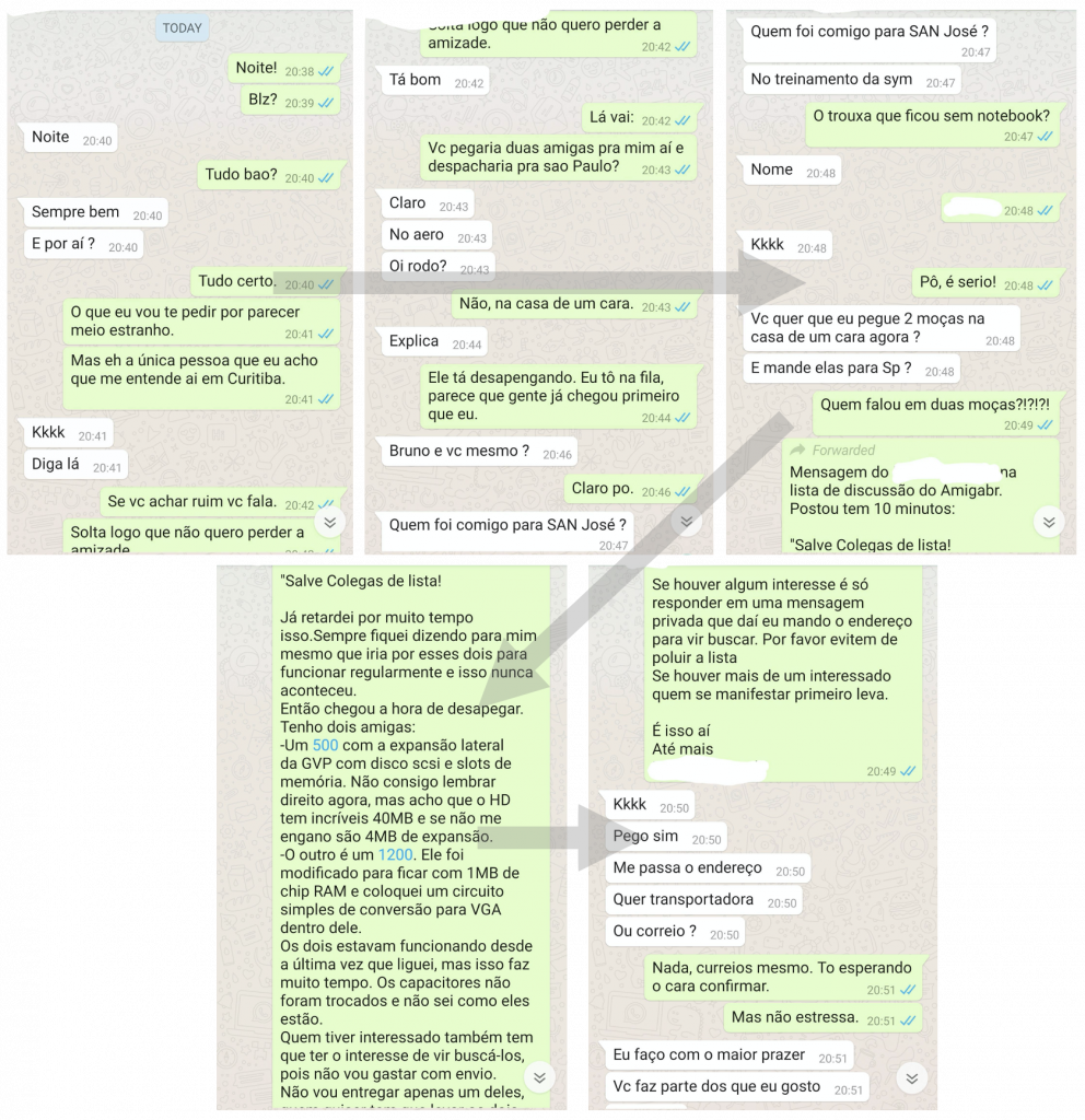 Aparece uma mensagem num grupo de Telegram sobre a doação de 2 microcomputadores Commodore Amiga. Um A500 e outro A1200. Poxa, o A1200 era um desejo antigo, dos modelos compactos é o mais poderoso (não tenho espaço nem pro A1200 aqui em casa, quiça um A4000 trambolhão).
