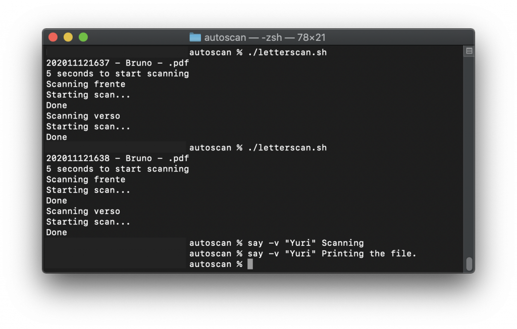 Inicialmente iria colocar um aviso sonoro (beeeep!) que alertaria quando trocar o lado da página. Só que tropecei no comando ‘say’. Ai começou a ficar divertido colocar a máquina pra falar! Pra ficar mais engraçado, voce pode trocar o sotaque de quem fala através do parâmetro -v. Por que não sotaque britânico (Samantha)? Ou ainda francês (Thomas)? Russo (Yuri) também ficou legal!