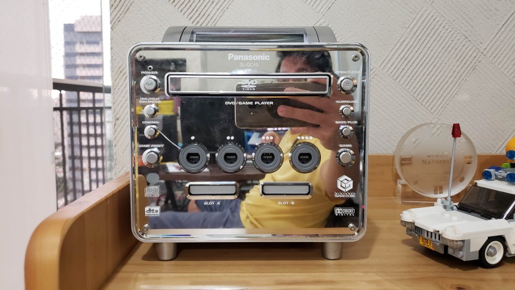 Ele é espelhado! Com acabamento em metal cinza e um display em cima. Alem de jogos de GameCube ele toca DVD também.