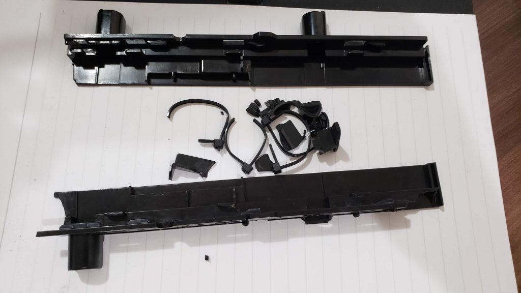 Uma torre quebrou completamente, os pinos de alinhamento só sobraram 2 num total de 6, as entradas se foram junto. E essas braçadeiras? Alguém já havia tentado consertar e amarrou o módulo do leitor depois que não obteve sucesso. Primeira vez que vejo uma gambiarra vinda de leilão japônico. Ainda tem pedaço do trilho dentro dele, mas precisaria desmontar muuuuito mais para chegar até eles. Deixa quieto.