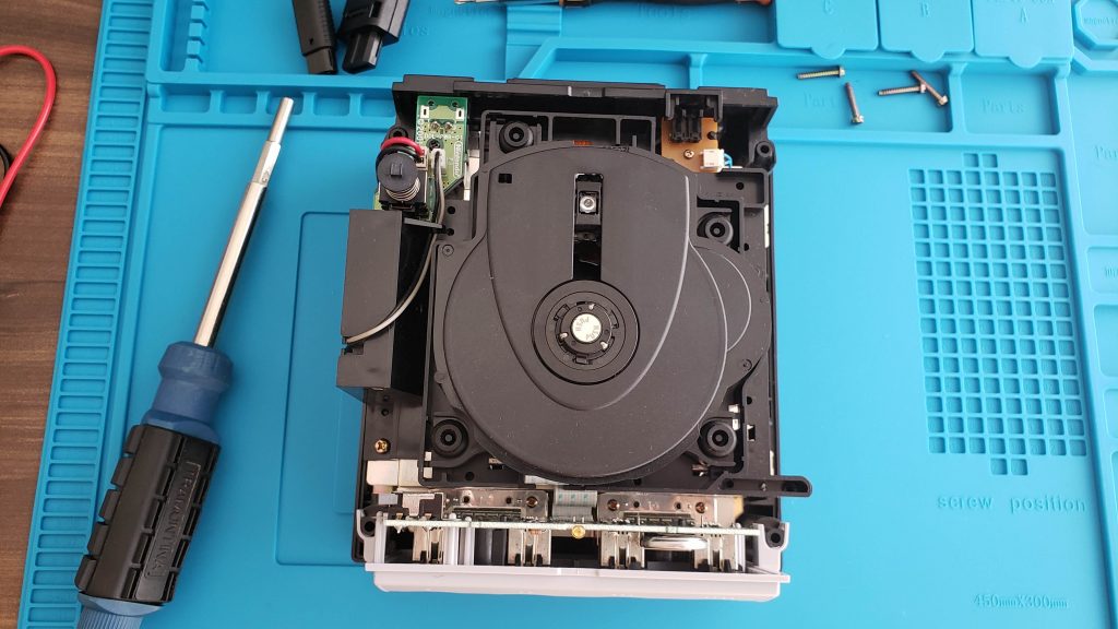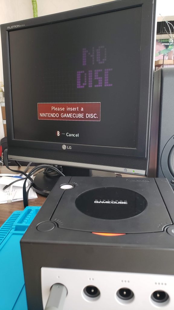 Foi mal ai pela foto em pé, mas precisava pegar o GC e a tela de erro. O disco gira, o laser mexe e… nada.