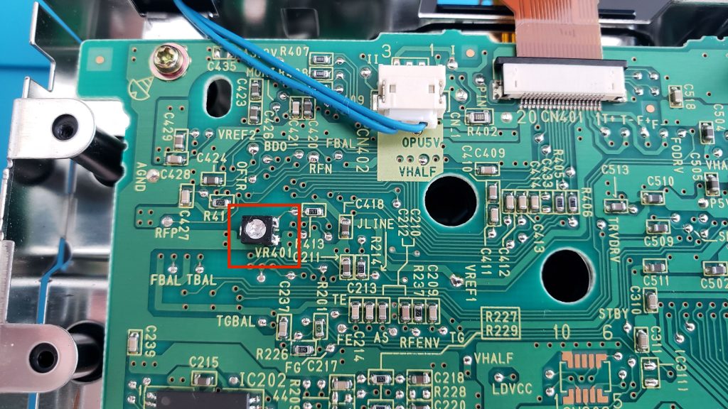 O tal potenciômetro que deve ser ajustado é esse VR401: