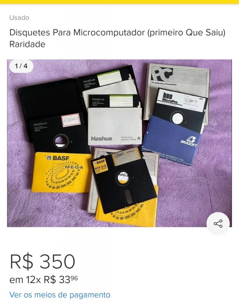 350,00 (trezentos e cinquenta!!) moedas por 5 disquetes genéricos usados, provavelmente mofados e desmagnetizados com uma descrição fantasiosa.